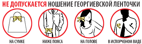 Сегодня из наградной лента стала символической. Однако требует она не меньшего почтения. Потому вешать ее на сумку или завязывать на запястье, мягко говоря, не корректно. Также не стоит размещать ленту на головном уборе, завязывать в волосы, прикреплять на брюки, и, конечно, на обувь.