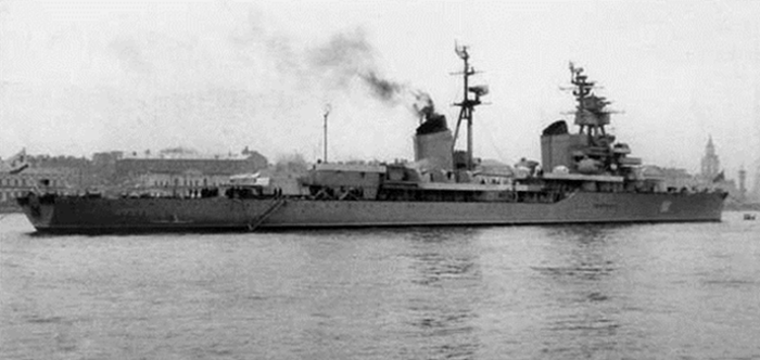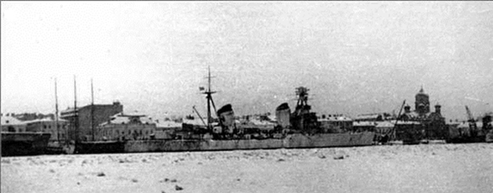 Советский легкий крейсер «Киров» у набережной Невы в блокадном Ленинграде.