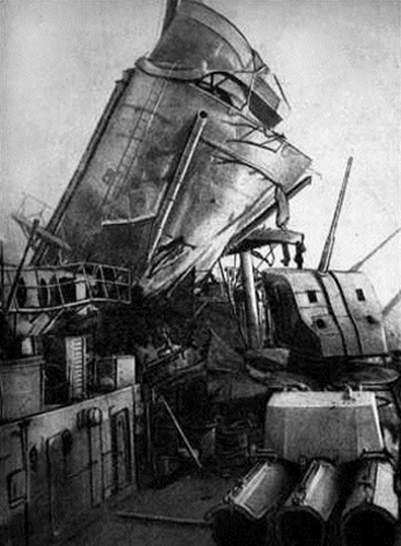 Повреждения, полученные крейсером в результате попадания бомбы в апреле 1942 г.![]()