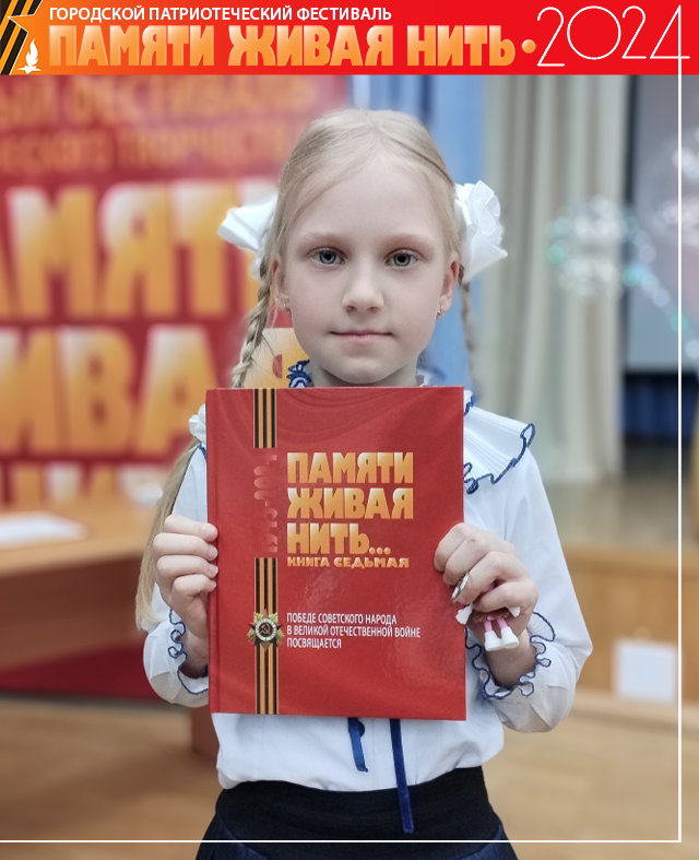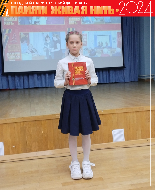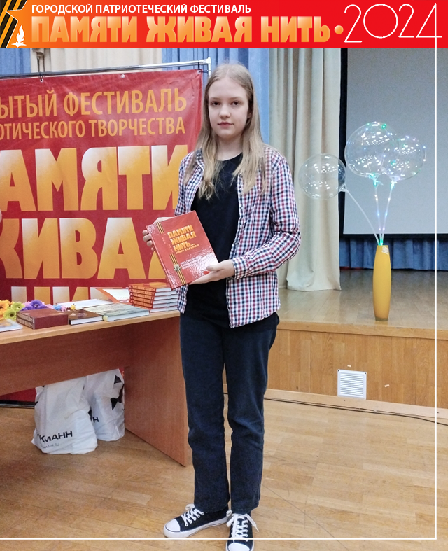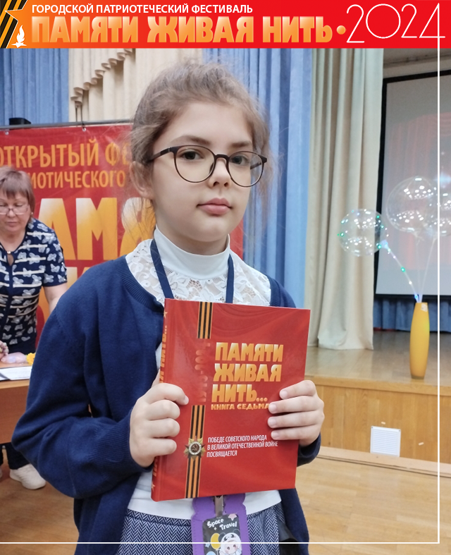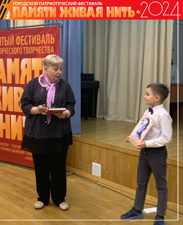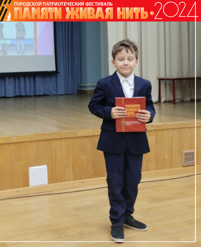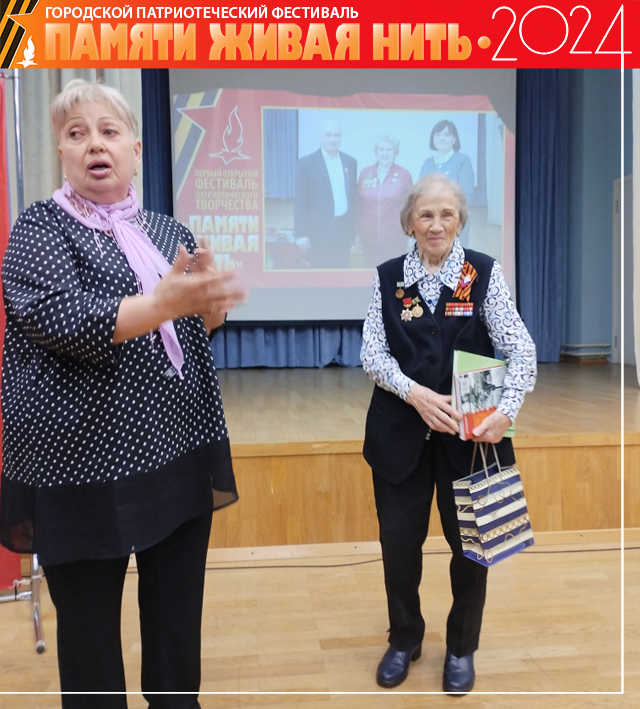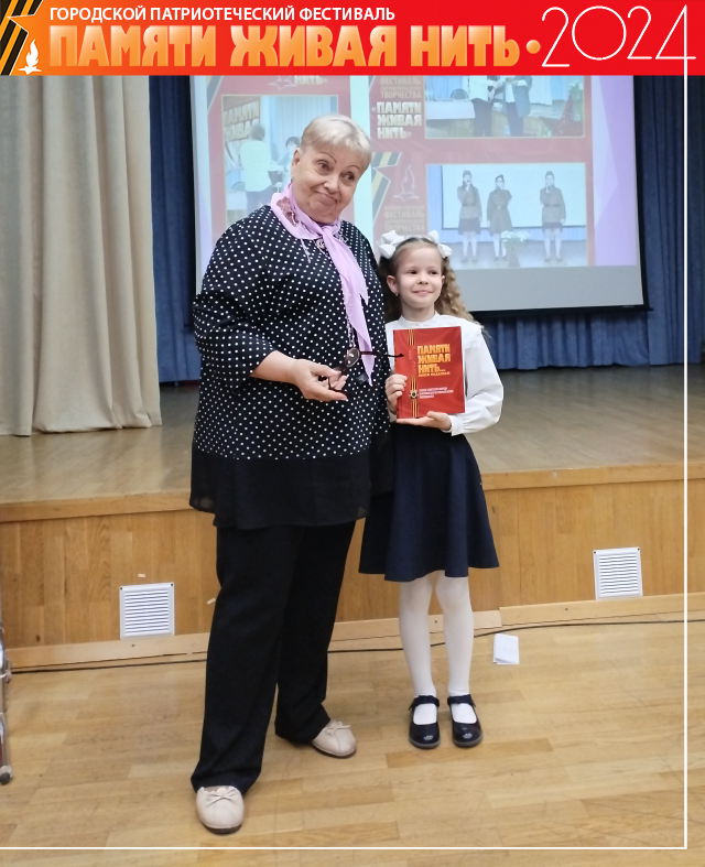 15 мая 2024 года в актовом зале школы № 763 прошло вручение авторских экземпляров только что вышедшей седьмой книги патриотического проекта «Памяти живая нить». Книги получили наши авторы Алиса Хрущева и Софья Николаева, Денис Кораблев и Арсений Жандубаев, Ирина Стрельникова и Мария Попович, Любовь Солодилова, Мария Красовская и Никита Чубарых, учителя Мария Александровна Киреева, завуч школы Катанский Алексей Алексеевич. Также свои экземпляры получили авторы стихов, опубликованных в книге: Яна Паламарчук, Серафим Левченко и Елена Вячеславовна Грозова. Стихи ветерана войны Марии Головиной прочитала наш большой друг и постоянный автор проекта Любовь Ивановна Баулина. Она получила свой авторский экземпляр книги за интереснейший материал о своем отце. Завуч школы Алексей Алексеевич Катанский поблагодарил всех кто работал над изданием за очень нужный и своевременный проект и за прекрасное оформление книги. На мероприятии присутствовала и один из авторов нашего проекта Сильванская Зоя Ивановна, пережившая ребенком все ужасы блокады. Изумительный, позитивный, очень светлый человек!