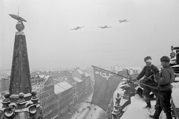 Советские бойцы вывешивают советский флаг на одном из зданий