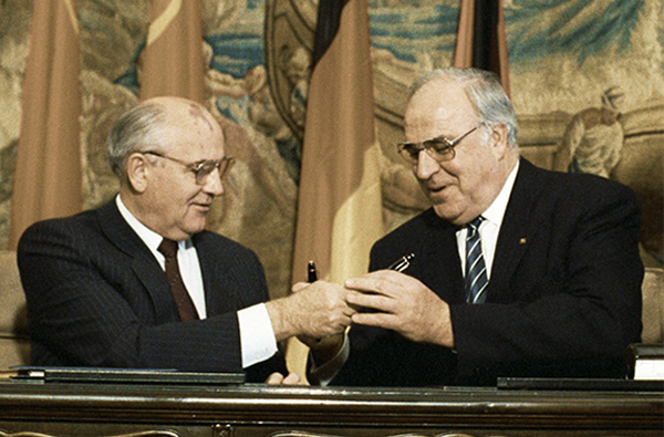 Самую активную роль в процессе объединения Германии (а фактически поглощения восточной части страны Западной Германией) играл канцлер ФРГ Г. Коль, успевший наладить с Горбачевым дружеские отношения. В ноябре 1989 г. «берлинская стена» рухнула. Была открыта государственная граница между Восточной и Западной Германией. 12 сентября 1990 г. в Москве был подписан договор СССР, США, Великобритании, Франции, ГДР и ФРГ об объединении Германии. Объединенная Германия признала послевоенные границы с Польшей, СССР и Чехословакией, заявила, что с ее земли будет исходить только мир, обязалась не производить и не иметь на своей территории ядерное, химическое и бактериологическое оружие, сократить сухопутные и военно-воздушные силы. Государство ГДР исчезло с карты Европы.