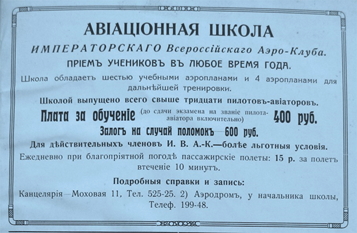 Здесь же, на Комендантском аэродроме, действовала и авиашкола Императорского всероссийского аэроклуба, в которую с осени 1914 года начали принимать вольноопределяющихся и солдат. В 1917 году именно в этой школе Сергей Ильюшин и получил первые летные уроки. Как вспоминал сам авиаконструктор, после одного из первых полетов инструктор внезапно сказал ему, что человек с такими точными и плавными движениями может прямо сейчас претендовать на получение диплома авиатора. Но закон есть закон: за лето Ильюшин прослушал весь курс обучения и отлетал положенные 23 летных дня, после чего и получил вожделенную синюю книжечку – удостоверение пилота-авиатора Международной воздухоплавательной федерации, представителем которой в России был Императорский всероссийский аэроклуб.