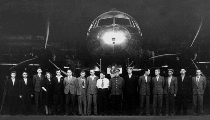С. В. Ильюшин (седьмой справа) среди сотрудников ОКБ и опытного производства,