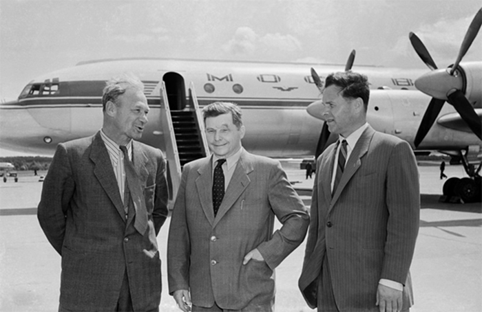 и главный конструктор Виктор Бугайский у самолета ИЛ-18. 1957 г.![]()