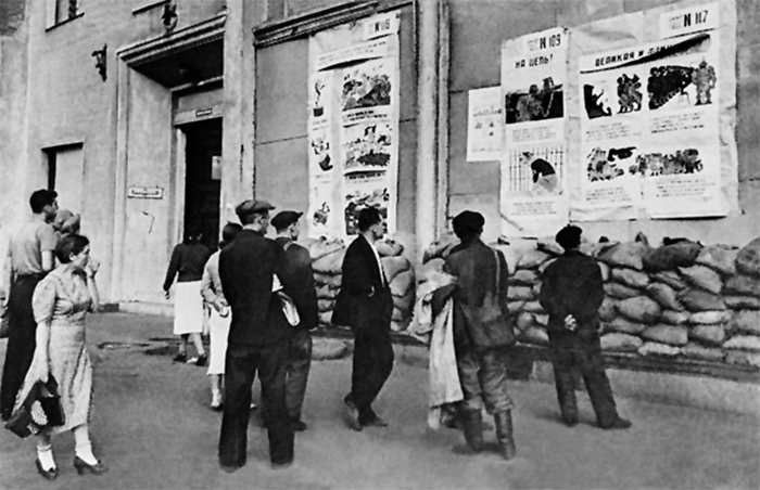Москвичи рассматривают агитационные плакаты на улице Горького в Москве. 1941 г.![]()