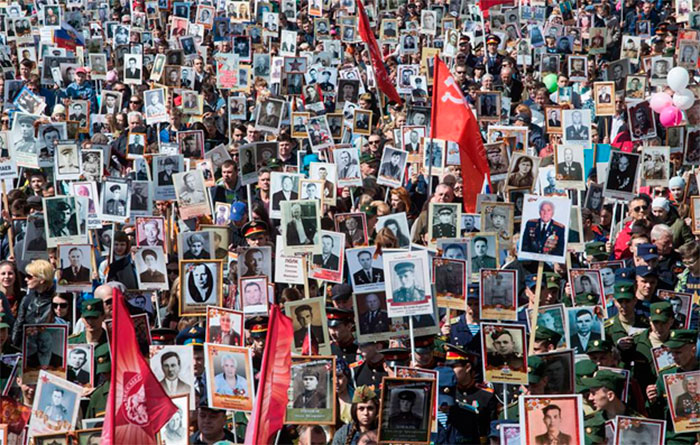 С 2012 года в России, а теперь и во многих городах мира проходит общественная акция «Бессмертный полк». В рамках акции 9 мая или в ближайшие даты ее участники проходят колонной, неся транспаранты с фотографиями своих родственников-ветеранов. Акция «Бессмертный полк», прошедшая в 2019 году прошла более чем в 100 странах мира и объединила миллионы людей по всему миру.