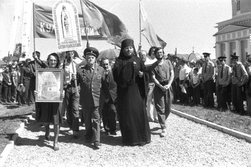 «Множество людей, направляющихся к шоссе, ведущему в Городок, встречали усиленные наряды милиции. Из мегафона доносился металлический голос: «Немедленно освободите проезжую часть дороги!» Прибывших людей, не обращая внимания на их пол и возраст, сталкивали с шоссе в непролазную грязь. Около пяти тысяч человек во главе с полковником Левшовым, держащим в руках красное развернутое знамя, привезенное из Берлина, художником Сычевым и монахом Гермогеном, построившись в колонну, буквально с боем проходили сначала сквозь один, потом сквозь другой кордон милиции.