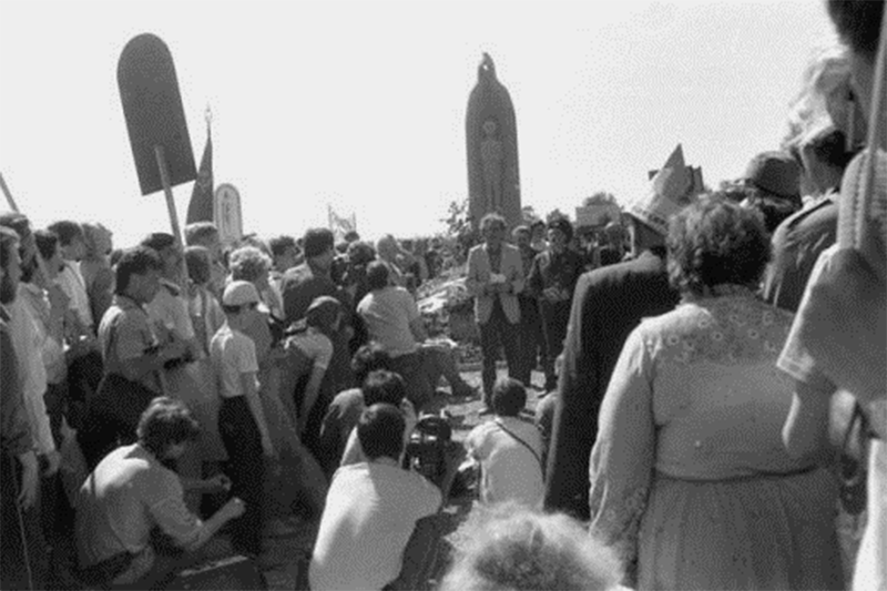 «Неожиданно дождь, шедший весь день, прекратился, и ослепительное солнце залило холмы и заиграло на знаменах и хоругвях. Полковник Ерофей Левшов призывает присутствующих дать клятву, что памятник Сергию Радонежскому будет стоять в Городке во что бы то ни стало.Тысячи людей хором скандируют: «Клянемся! Клянемся! Клянемся!» Люди отказывались разойтись, пока от властей не будет дано официальное разрешение на установку памятника».