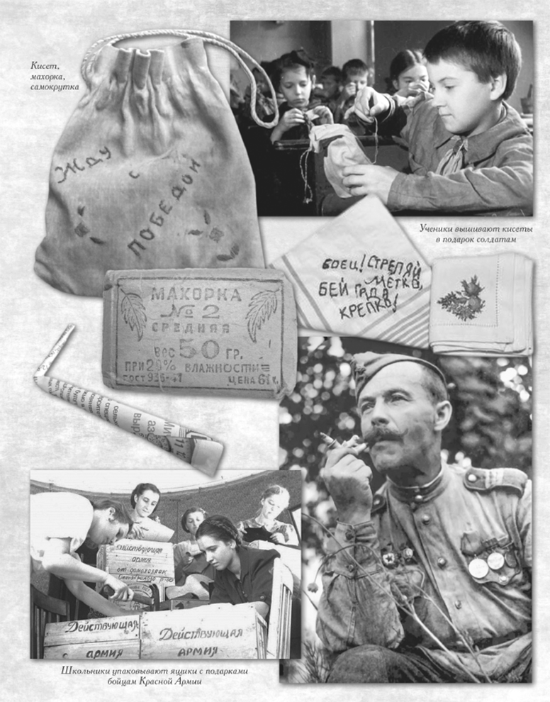 Кисет – это мешочек для хранения обычного табака или махорки. Во время войны кисет был важным атрибутом бойца Красной Армии. Сигареты и папиросы в годы войны были большой роскошью. В качестве пайка выдавалась махорка в пачках, а потом пересыпалась солдатами в кисет. Выглядела махорка как сильно измельченный табак. Из этой табачной смеси делали «самокрутки»: брали клочок бумаги, обычно от газеты, скручивали в трубочку и набивали ее махоркой. Великой радостью для бойцов было получить посылку из тыла, так как почти в каждой был кисет с махоркой. На кисетах делали вышивку, по которой сразу было видно, кто ее делал – взрослая или детская рука. Пожилые солдаты предпочитали кисеты с детскими вышивками, а молодые парни носили кисеты, которые расшивали девушки. В кисете часто хранились письма и фотография из дома. На кисетах вышивали слова: «Смерть немецким оккупантам!», «Ждем с победой!». Носили такие кисеты на ремнях поверх одежды, чтобы было видно.