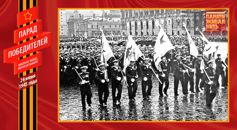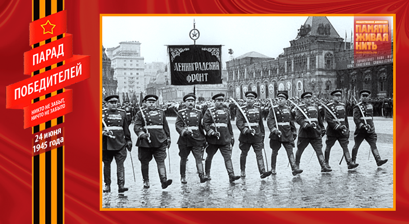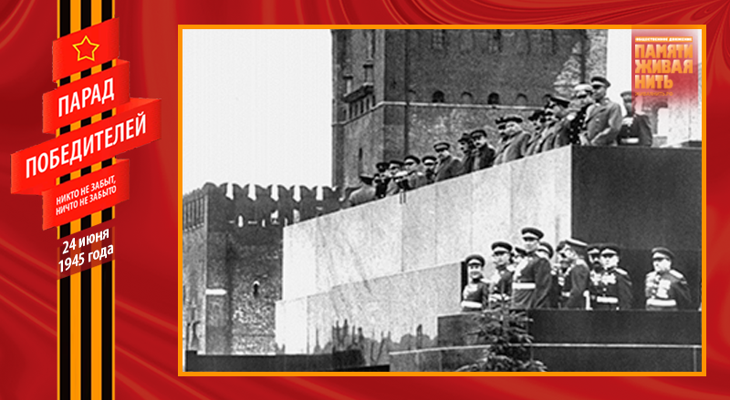 И вот наступило утро 24 июня 1945 года, пасмурное и дождливое. Вода стекала по каскам и обмундированию построенных к 8 часам сводных полков фронтов, слушателей военных академий, курсантов военных училищ и войск Московского гарнизона. К девяти часам гранитные трибуны у Кремлёвской стены были до отказа заполнены депутатами Верховного Совета СССР и РСФСР, работниками наркоматов, деятелями культуры, участниками юбилейной сессии Академии наук СССР, тружениками московских заводов и фабрик, иерархами Русской православной церкви, иностранными дипломатами и многочисленными зарубежными гостями. В 9 часов 45 минут под аплодисменты собравшихся на Мавзолей поднялись члены Политбюро ЦК ВКП во главе с И. В. Сталиным. За пятнадцать минут до начала парада пошел дождь, перешедший в ливень. Стоявший на трибуне Мавзолея Сталин и маршалы вымокли насквозь. Промокший парадный мундир Рокоссовского, когда высох, сел так, что снять его оказалось невозможно – пришлось распарывать. Распогодилось только к вечеру.