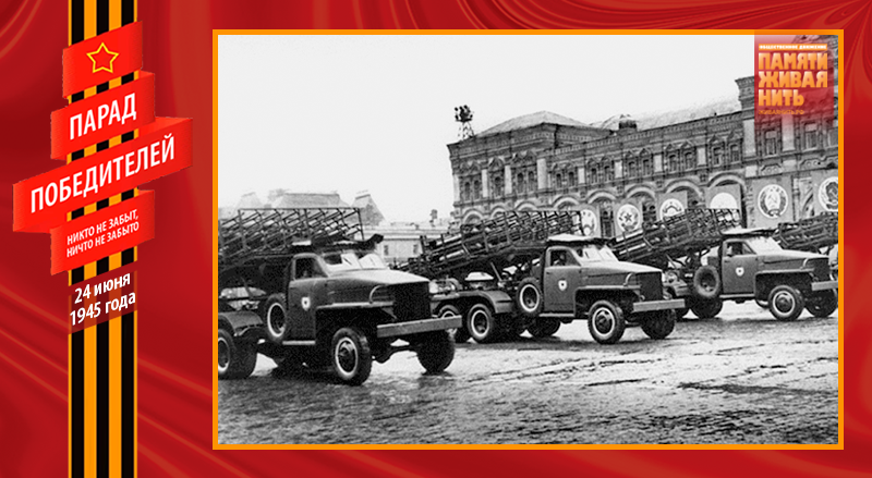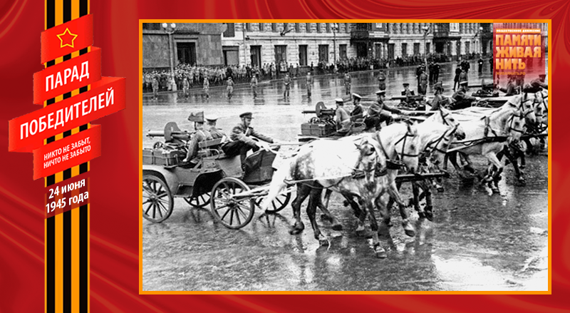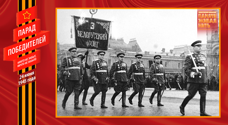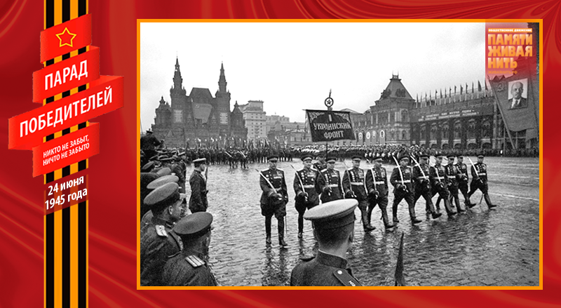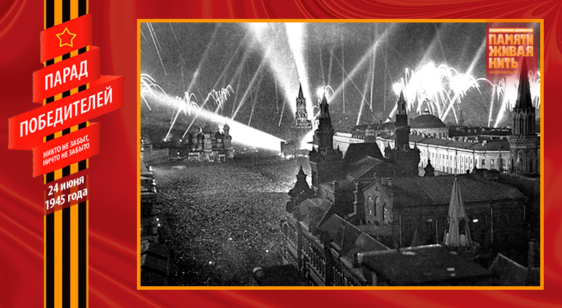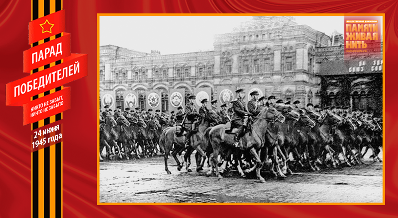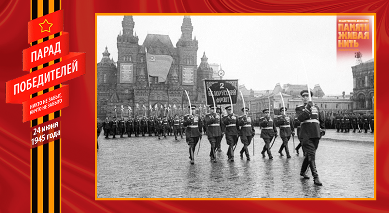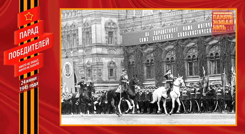 Военный парад 24 июня 1945 года – это триумф народа-победителя, военного искусства советских полководцев, всех Вооружённых Сил, их боевого духа. В нём приняли участие 24 маршала, 249 генералов, 2536 других офицеров, 31116 солдат и сержантов, 1850 единиц боевой техники. Одним из многих неординарных, трогательных моментов Парада Победы, стал пронос по Красной площади героического пса-сапёра Джульбарса. Раненный незадолго до этого, он не мог самостоятельно идти, о чём было доложено К. К. Рокоссовскому, который сообщил об этом И. В. Сталину. Верховный Главнокомандующий распорядился израненного пса нести на руках – на его собственном парадном кителе, превращённом в носилки.