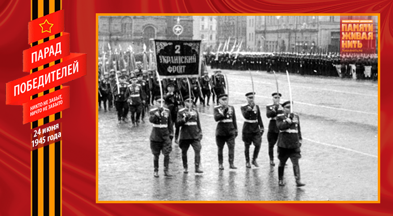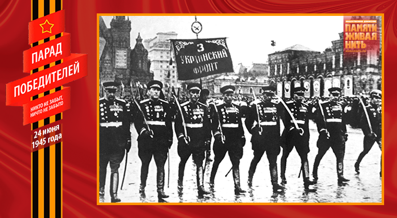 Затем сводные полки фронтов в том порядке, в каком располагались они во время войны, с севера на юг – от Баренцева моря до Чёрного: сводный полк Ленинградского фронта во главе с маршалом Л. А. Говоровым, сводный полк 1-го Прибалтийского фронта во главе с генералом армии И. X. Баграмяном, сводный полк 3-го Белорусского фронта во главе с маршалом А. М. Василевским, сводный полк 2-го Белорусского фронта во главе с генерал-полковником К. П. Трубниковым, сводный полка 1-го Белорусского фронта во главе с генералом армии В. Д. Соколовским, сводный полк 1-го Украинского фронта во главе с маршалом И. С. Коневым, сводный полк 4-го Украинского фронта во главе с генералом армии А. И. Ерёменко, сводный полк 2-го Украинского фронта во главе с маршалом Р. Я. Малиновским и 3-й Украинский фронт во главе с маршалом Ф. И. Толбухиным. Замыкал шествие сводный полк Наркомата Военно-Морского Флота во главе с вице-адмиралом В. Г. Фадеевым.