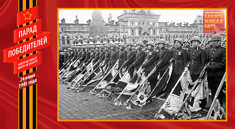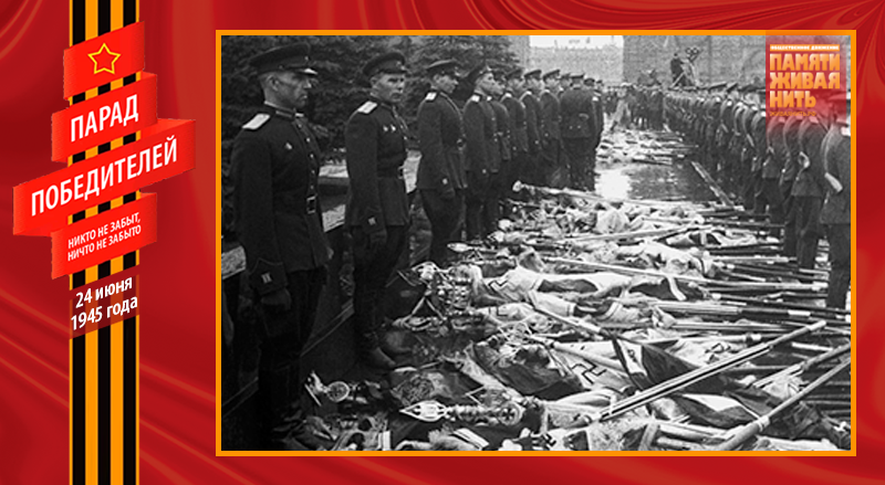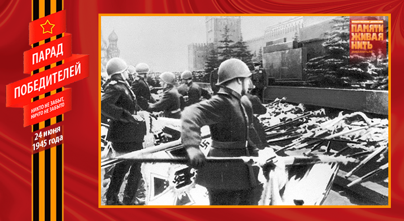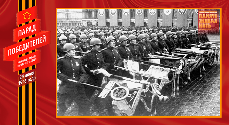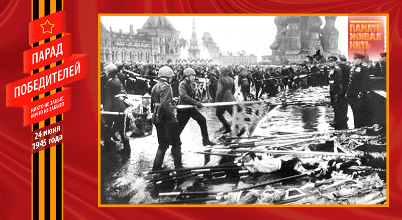 И вдруг оркестр смолк, и в этой тишине начали бить 80 барабанов. Вперёд вышла особая рота с двумя сотнями вражеских знамён. Все бойцы, несшие вражеские знамёна, были в перчатках, что символизировало отвращение и брезгливость к нацистским регалиям. У подножья Мавзолея были сделаны два специальных деревянных помоста, чтобы не осквернять священную землю Красной площади. Поравнявшись с ними, бойцы делали поворот направо и с силой бросали на них гордость третьего рейха. Первым швырнули личный штандарт Гитлера, последним – знамя армии Власова. Фашистские полотнища устилали помост. Трибуны взорвались аплодисментами. Дробь барабанов продолжалась, а перед Мавзолеем росла гора предаваемых позору вражеских знамён... Вечером того же дня помост и все перчатки были сожжены.