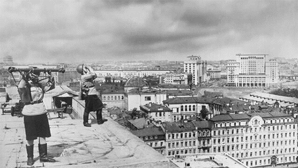 Девушки из местной противовоздушной обороны (МПВО) на крыше московского дома![]()