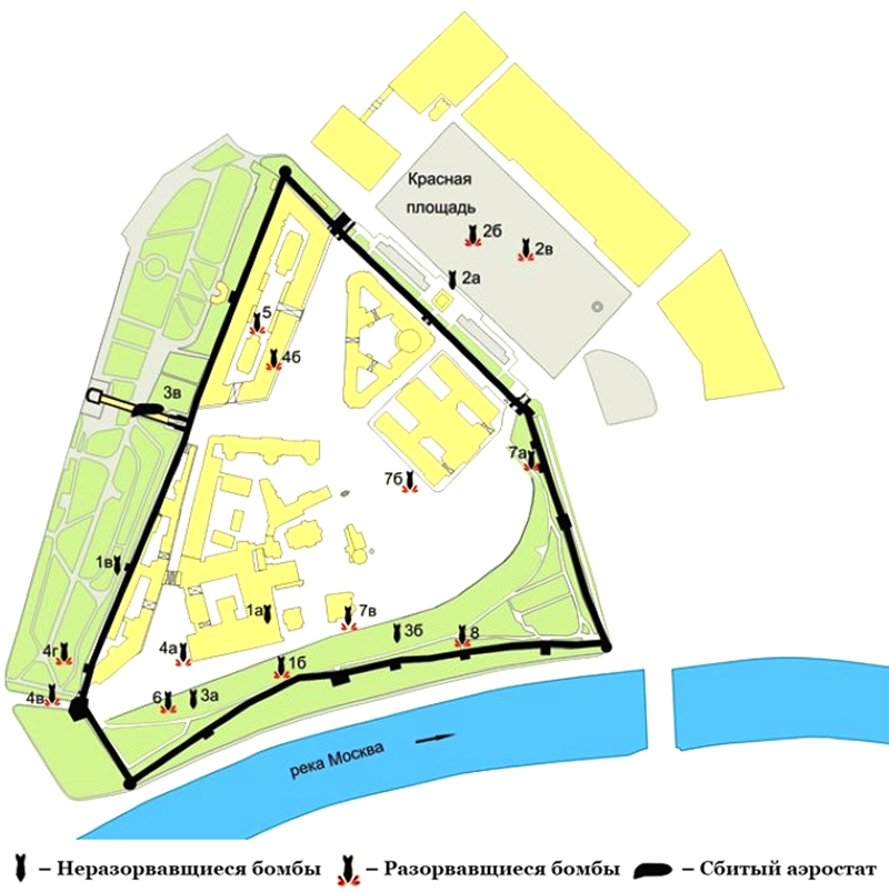 с указанием мест попадания авиационных бомб противника в 1941–1942 годах![]()