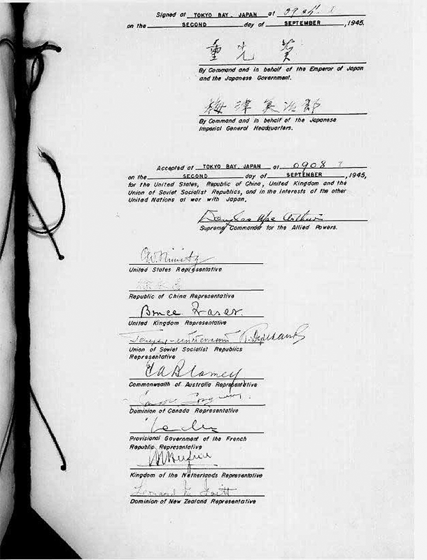 Формальная капитуляция Японии была подписана 2 сентября 1945 года в 9:02 по токийскому времени на борту американского линкора «Миссури» в Токийском заливе. Для СССР, который вместе с другими союзниками принял капитуляцию Японии, этот документ стал актом выполнения соглашений Ялтинской конференции 1945 года в части возвращения под его суверенитет Южного Сахалина и Курильских островов.