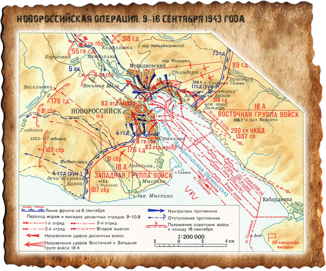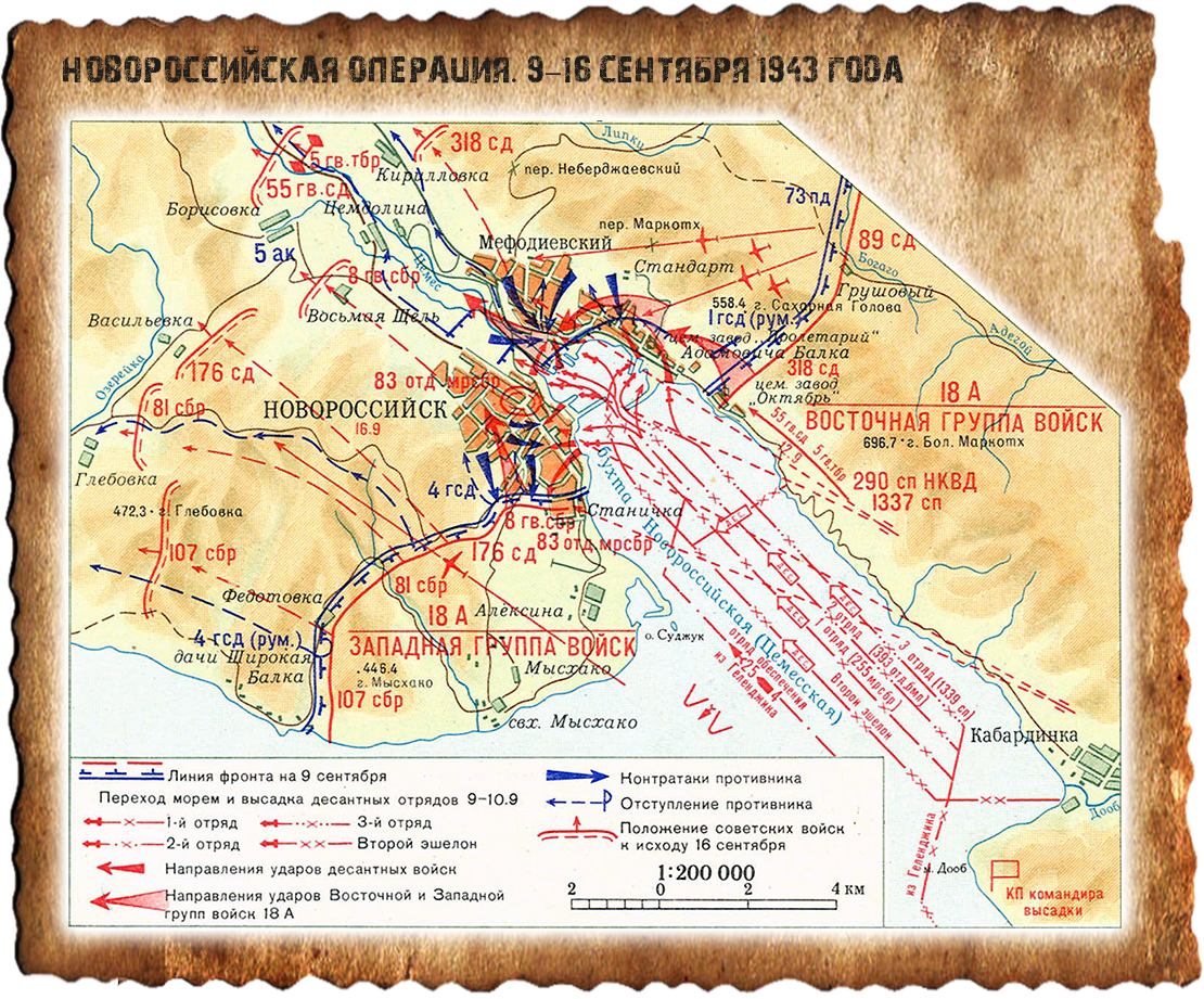 Ночью 10 сентября 1943 года после артиллерийской подготовки и ударов с воздуха катера и боты Черноморского флота вышли из Геленджика и к рассвету с боем ворвались в Новороссийский порт. Было высажено 3 десантных отряда численностью около 4000 человек. Второй эшелон десанта под шквальным огнем удалось высадить лишь в ночь на 11 сентября.