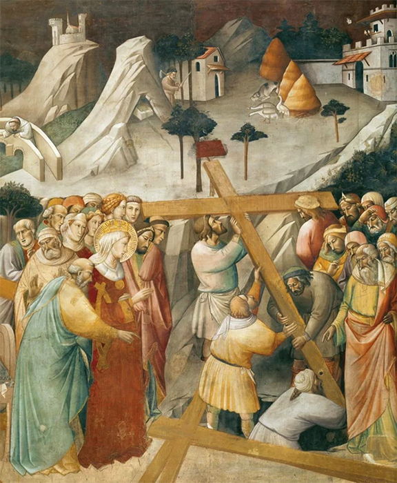 Разыскивая Животворящий Крест, царица Елена расспрашивала христиан и иудеев, но долгое время ее поиски оставались безуспешными. Наконец, ей указали на одного старого еврея по имени Иуда, который сообщил, что Крест зарыт там, где стоит капище Венеры. Капище разрушили и, совершив молитву, начали копать землю. Вскоре были обнаружены Гроб Господень и неподалеку от него три креста, дощечка с надписью «Иисус Назорей, Царь Иудейский», сделанная по приказанию Пилата, и четыре гвоздя, пронзившие Тело Господа.