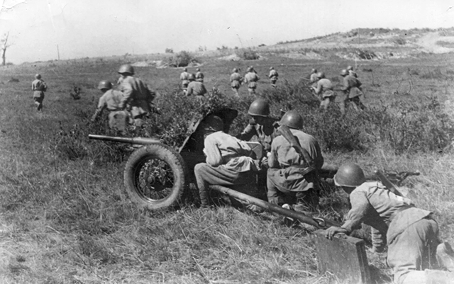 в сопровождении противотанковой пушки штурмует вражеский опорный пункт![]()