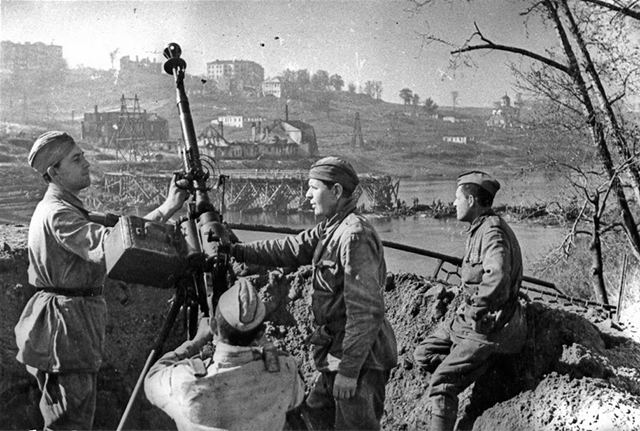 Зенитчики охраняют город от налетов вражеской авиации. Сентябрь 1943 г.![]()