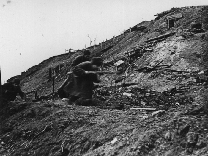Группа красноармейцев пробирается к укреплениям противника. г. Сталинград, 1942 г.![]()