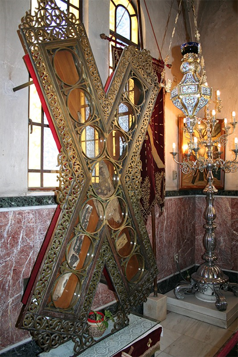 Крест апостола Андрея Первозванного в соборе святого Андрея в Патрах.![]()