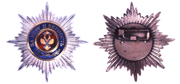 Звезда ордена серебряная, восьмилучевая. В центре звезды, в круглом медальоне, покрытом красной эмалью, рельефное позолоченное изображение двуглавого орла, увенчанного тремя коронами. На груди орла – изображение покрытого синей эмалью Андреевского креста. Вокруг медальона – покрытая синей эмалью кайма с позолоченной окантовкой. На кайме прямыми позолоченными буквами написан девиз ордена: «ЗА ВЕРУ И ВЕРНОСТЬ». В нижней части каймы – изображение двух скрещенных лавровых ветвей, покрытых зеленой эмалью и перевязанных позолоченной лентой.