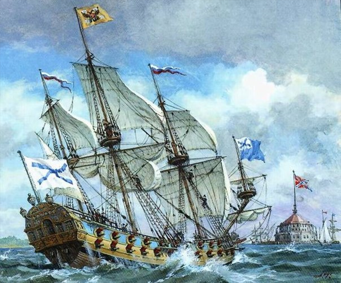 Линейный корабль петровского флота «Полтава» под Андреевским флагом![]()