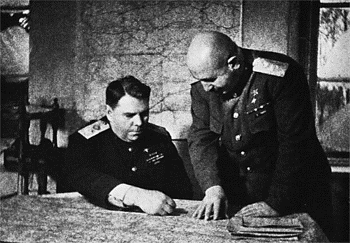 и его заместитель генерал армии И.Х. Баграмян уточняют план штурма Кенигсберга. 1945 г.![]()