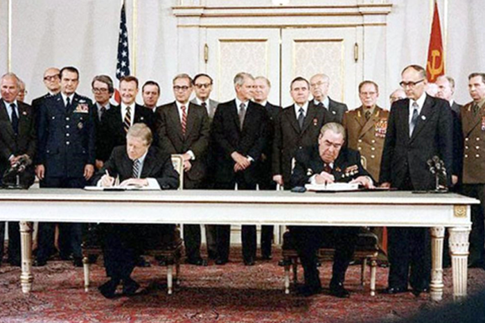 Президент США Джимми Картер и Генеральный секретарь ЦК КПСС Леонид Брежнев на подписании договора о сокращении стратегических наступательных вооружений СНВ-2. 1979 г.