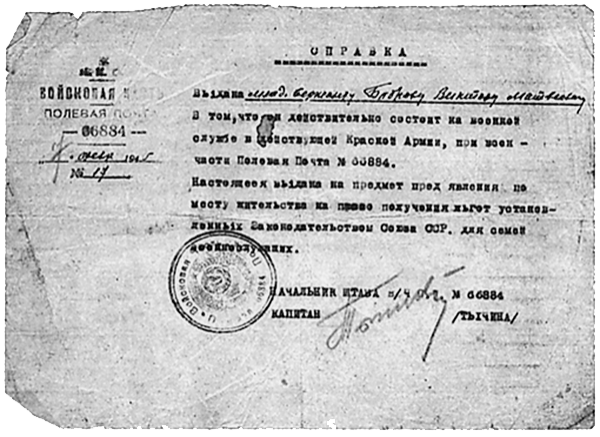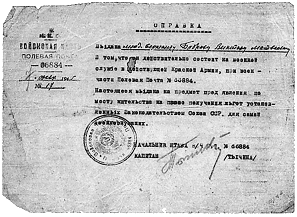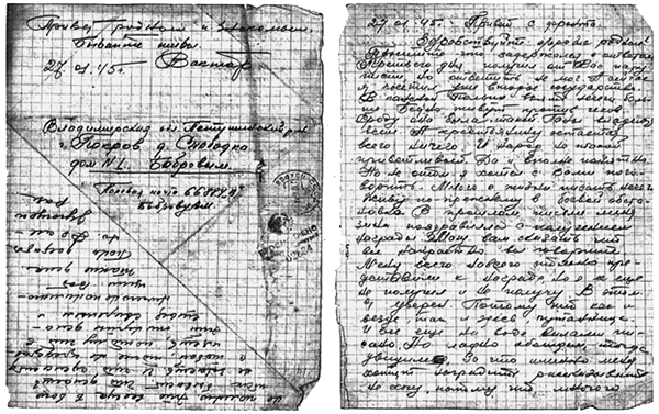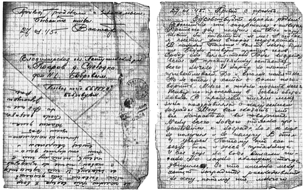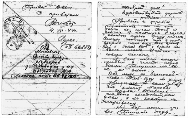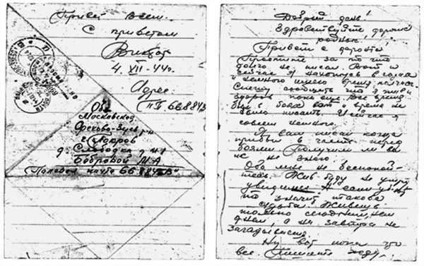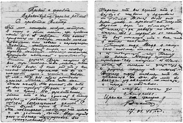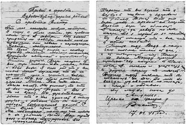 «Здравствуйте, Зинаида Матвеевна! Шлю Вам и всей Вашей семье фронтовой боевой привет! Ваше письмо, посланное на моё имя, я получил, за что сердечно благодарю. Письмо было прочитано всему личному составу. Виктор немного сконфузился, но ничего. Это ему честь и хвала. Ваши слова совершенно правдивы, и я думаю, что Виктор их оправдает с честью. Его наградили орденом Славы III степени – это высшая награда для сержантского и рядового состава. Ему надо гордиться, что командование ценит его подвиги.