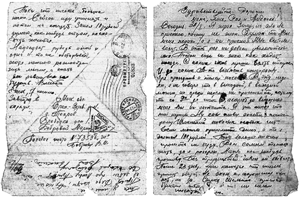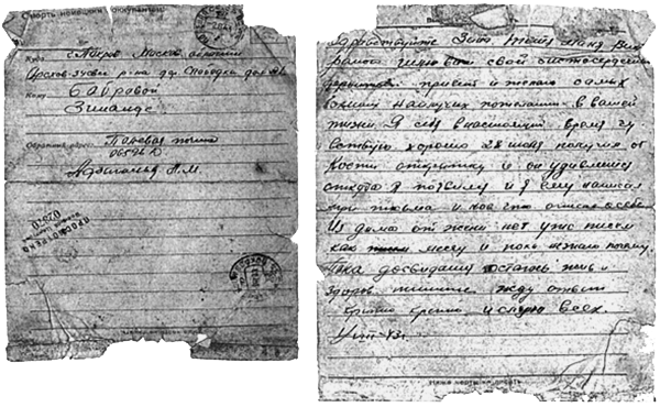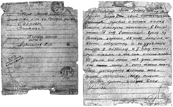 Спешу сообщить, что я жив и здоров. От Зины я получил третьего дня письмо. Пишет, что живете хорошо, я очень рад этому. Говорите, что помещение занимают военные. Это хорошо. Главное, что есть, что кушать, и есть, чем натопить хату.