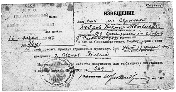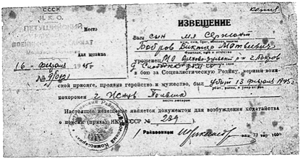 В середине февраля в Покров на имя Бобровой Марии Афанасьевны пришло извещение о том, что 13 февраля 1945 года ее сын младший сержант Виктор Матвеевич Бобров убит и похоронен в Польше. Обстоятельства гибели родные узнали только в конце августа 1946 года, когда из города Станислав пришло письмо от друга Виктора Боброва Михаила Замолодчикова. Он пишет, что Виктор погиб под городом Живец, в селе Мощаницы. Вот выдержка из его письма: «Во второй половине дня мы предприняли наступление. Завязались ожесточенные бои. На укрепленном пункте мы выжидали удобного момента для атаки. Виктор находился метрах в ста от меня за занятым нами домиком, укрываясь от вражеского обстрела. Внезапно раздался взрыв артиллерийского снаряда, за которым последовал сильный обстрел. Огонь был сконцентрирован на нашем подразделении. После обстрела мы бросились к разбитому дому, за которым укрывался Виктор и другие бойцы. Здесь мы нашли павших, в числе которых был и Виктор. Павшие были похоронены в селе Мощаницы».