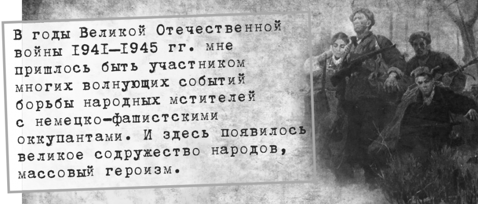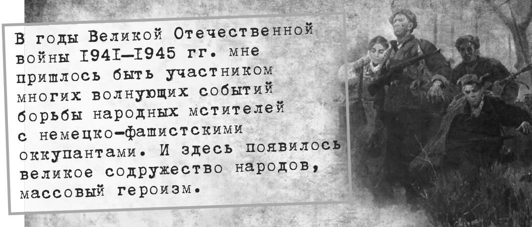 В годы Великой Отечественной войны 1941–1945 годов мне пришлось быть участником многих волнующих событий борьбы народных мстителей с немецко-фашистскими оккупантами. И здесь появилось великое содружество народов, массовый героизм.