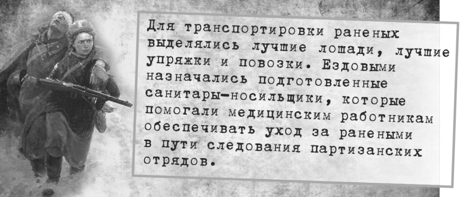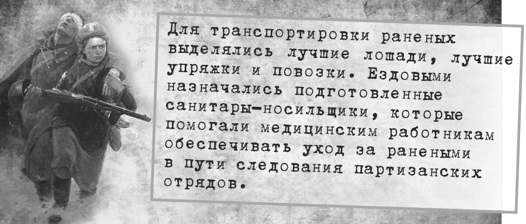 Для транспортировки раненых и больных выделялись лучшие лошади, лучшие упряжки и повозки. Ездовыми назначались подготовленные санитары – носильщики, которые помогали медицинским работникам выполнять врачебные указания и обеспечивать уход за ранеными в пути следования партизанских отрядов.