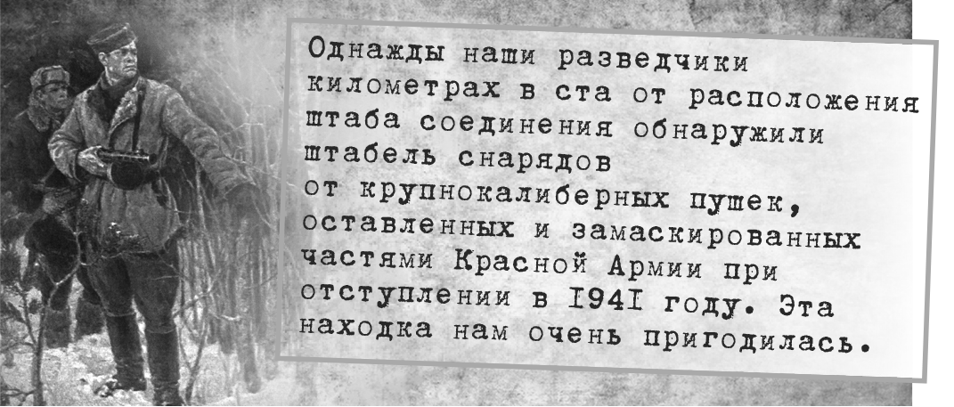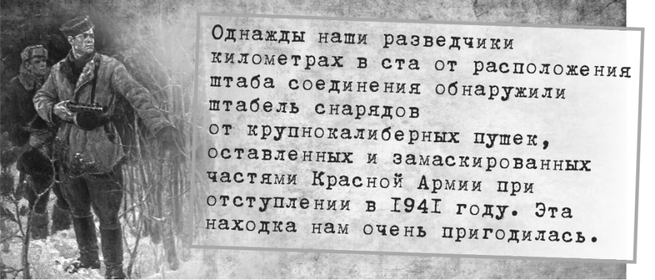 Однажды наши разведчики километрах в ста от расположения штаба соединения обнаружили штабель снарядов от крупнокалиберных пушек, оставленных и замаскированных частями Красной Армии при отступлении в 1941 году. Эта находка нам очень пригодилась.