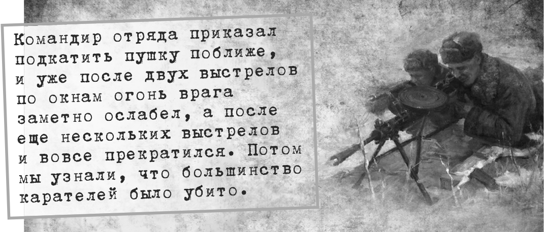 Выручила нас партизанская предусмотрительность. Дело в том, что мы на всякий случай захватили с собой 76-миллиметровую пушку. Мы не думали, что она нам понадобится, но оказалось, что как раз она-то нам и нужна. Командир отряда приказал подкатить пушку поближе, и уже после двух выстрелов по окнам огонь врага заметно ослабел, а после еще нескольких выстрелов и вовсе прекратился. Подобравшись к церковной двери, мы попытались ее открыть, но она была заперта изнутри. А возиться с нею времени у нас не было – к карателям вот-вот могло прибыть подкрепление из Глухова. И лишь потом мы узнали, что большинство находящихся в церкви карателей было убито и лишь несколько человек осталось в живых, да и те были ранены.