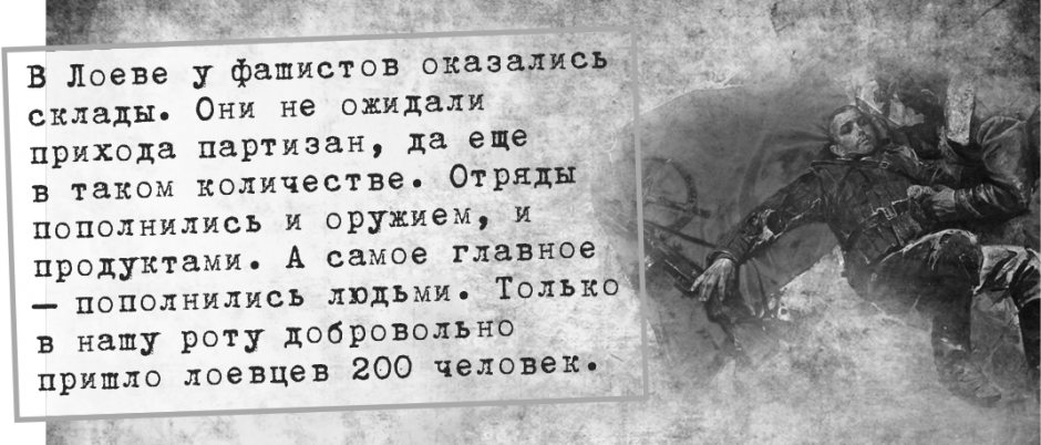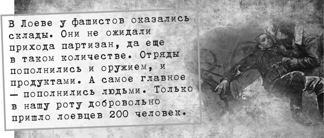 Наши отряды пополнились и оружием трофейным: пулеметами, автоматами, винтовками, боеприпасами. А самое главное – пополнились людьми. Только в нашу роту автоматчиков добровольно пришло лоевцев 200 человек. Они стали вместе с нами народными мстителями. Через несколько дней рота превратилась в крупный партизанский отряд, а вскоре и соединение.