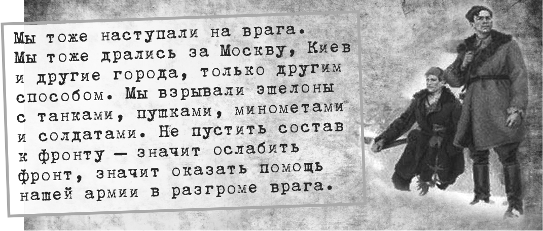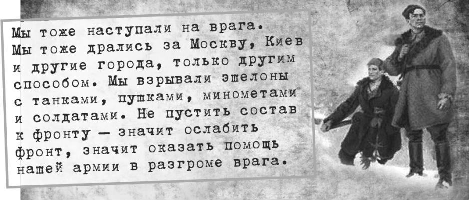 Мы тоже наступали на врага, содействовали успешному наступлению. Мы тоже дрались за Москву, Киев и другие города, только другим способом. Мы взрывали идущие к фронту эшелоны с танками, пушками, минометами и солдатами. Не пропустить состав к фронту – значит ослабить фронт, значит оказать помощь нашей армии в разгроме врага.