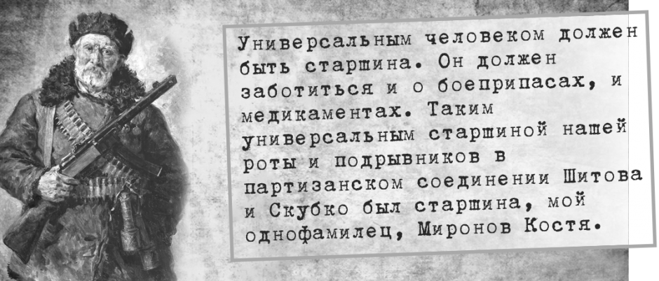 Универсальным человеком должен быть старшина. Он должен заботиться и о боеприпасах, и медикаментах, и перевязочных материалах. Таким универсальным старшиной нашей роты автоматчиков-разведчиков и подрывников в партизанском соединении Шитова и Скубко был старшина, мой однофамилец Миронов Костя.