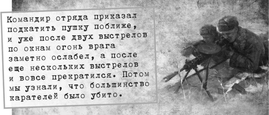 Уже в отряде, при допросе пленного, оказавшегося немецким полковником, выяснилось, что в тот момент, когда мы расстреливали карателей в церкви, полковник вместе с частью фашистов находился в здании школы. Понимая, что достаточно одного выстрела нашей пушки, чтобы от всех них ничего не осталось, полковник решил где-нибудь спрятаться.