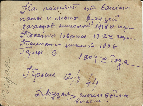 Знаю о деде только из его наградного листа. Знаю, что был он членом ВКП(б), в войне участвовал с 21 августа 1941 года, что имел медаль «За оборону Кавказа» (Указ Президиума Верховного Совета СССР от 01 мая 1944 г.). И вторая медаль «За отвагу» (22 февраля 1945 г.).