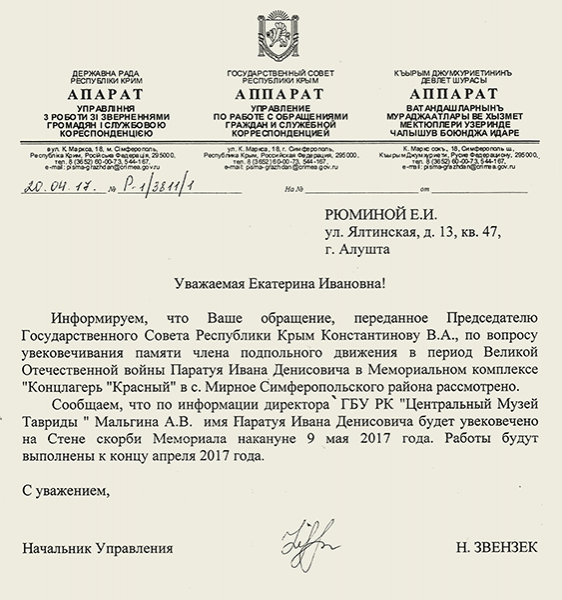 Один из сыновей Дениса Пантелеевича Паратуя – Иван родился в 1906 году. После окончания школы обучался на курсах механиков, работал в МТС, обслуживал винзавод «Алушта». Был оставлен в подпольной группе, а в апреле 1942 года, по доносу предателей, арестован вместе с подпольщиком Ляховецким и отправлен в концлагерь «Дубки» Симферопольского района. После допросов и пыток его расстреляли (документы по его делу не рассекречены до сих пор). Впоследствии в Дубках, рядом с улицей Маршала Жукова, на общей могиле родственники установили памятную доску с его именем.