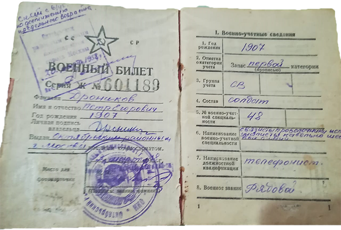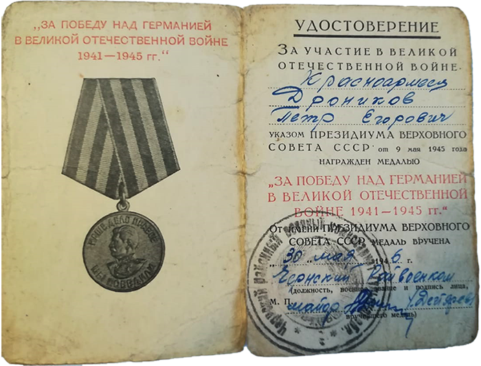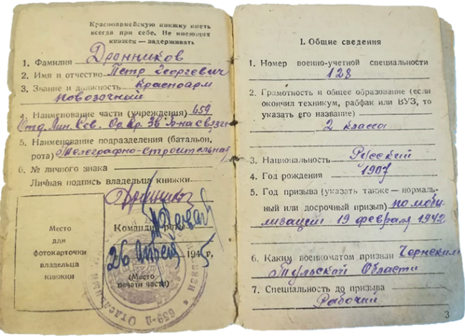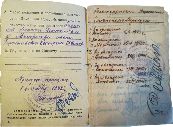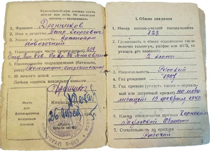 Мой дедушка Дронников Петр Егорович, 1907 года рождения, был призван в Красную Армию по мобилизации Чернским военкоматом Тульской области 19 февраля 1942 года. Присягу принял 1 декабря 1942 года.