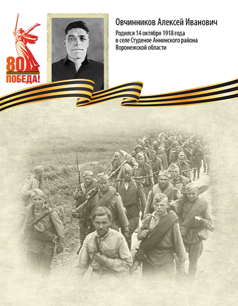 Мой прадедушка Овчинников Алексей Иванович родился 14 октября 1918 года в селе Студеное Аннинского района Воронежской области. Во время Великой Отечественной войны с 1941 по 1943 год героически сражался за нашу Родину.