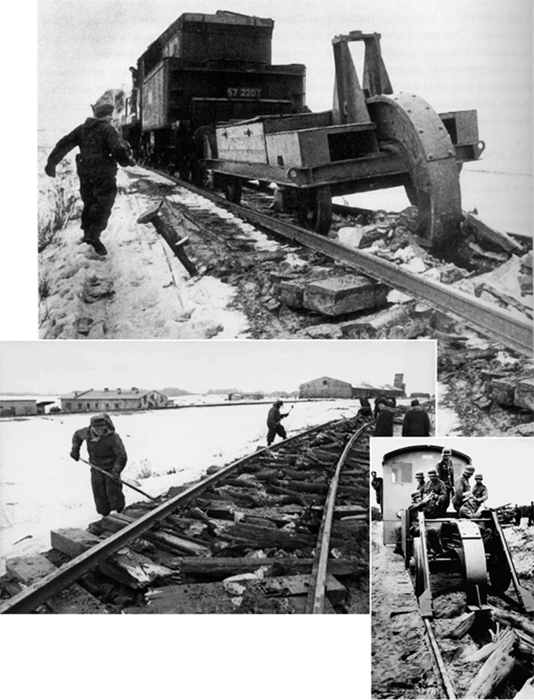 На фото: Schienenwolf разрушает советские железнодорожные пути при отступлении немцев зимой 1943 года![]()