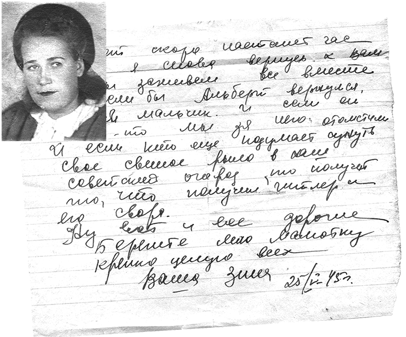С Казимиром связана странная история: последние письма датированы сентябрем 1941 года, но через несколько лет после окончания войны, кажется, года через два, в дом постучался человек и показал записку от Казимира с примерно таким текстом: «Лиза! Я жив, со мной (имя товарища, которого бабушка знала). Казимир». Мужчина показал записку и исчез. Предположений было много, но ни одно не подтвердилось.
