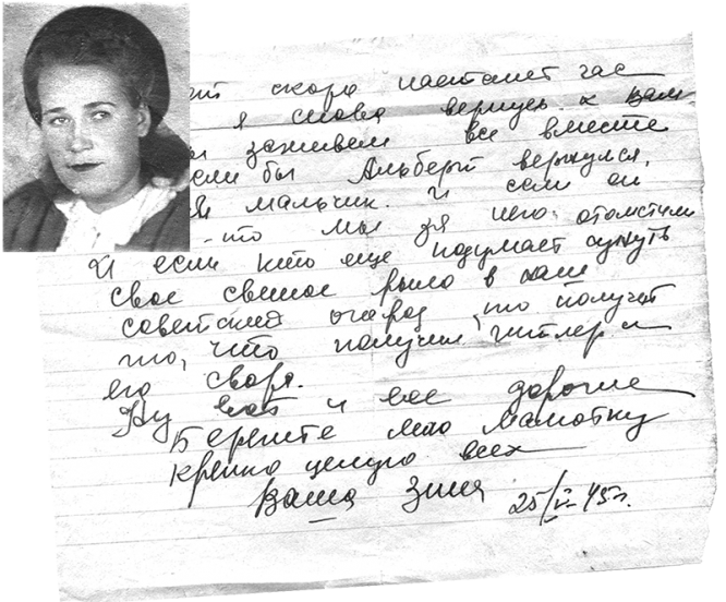 Тетя Зина – Зинаида Яковлевна Аренсон, наша родственница, еще успела понянчить мою дочь. Всю войну прошла писарем, делопроизводителем в штабе танковой армии. Война оказалась самым ярким и захватывающим событием в ее жизни. Все оставшиеся годы, работая в одном из райвоенкоматов Москвы, собирала своих однополчан по всему свету, искала, переписывалась, навещала, собирала на праздники Победы, вела огромную общественную работу. Один из однополчан, в мирное время ставший живописцем, написал ее портрет с военной фотографии – на фоне зеленеющего весеннего леса к березке прислонилась девчонка в военной форме, гимнастерка, прямая юбочка, берет, а в руке, кажется, веточка черемухи. Это май 45-го года.