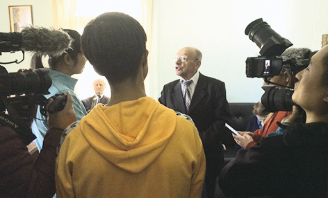 Участниками этой встречи были ветераны Великой Отечественной войны, а также люди, детство которых прошло в годы войны. Первый из героев встречи – Валерий Иванович Воронков. Он рассказал о своем тяжелом сталинградском детстве, а завершил выступление чтением стихотворения собственного сочинения «Малыши Сталинграда». Следующий из участников встречи – Борис Васильевич Тарасов, генерал в отставке. Он поделился своими воспоминаниями о том, как ребенком он пережил страшную блокаду Ленинграда. Еще один участник встречи – Владимир Михайлович Колосов, участник Великой Отечественной войны, также переживший подростком блокаду. Удивительный человек: до сих пор работает в школе, ведет шахматный кружок, любит ходить на лыжах, увлекается дайвингом. Иван Сергеевич Лонин – полковник в отставке, москвич. Освобождал Украину, Европу, закончил войну в Вене. Серьезно занимается пчеловодством, выпустил книгу в помощь начинающим пчеловодам. Лев Петрович Кашицын, родился в Ульяновске. В 1943 году поступил в танковое училище и является самым молодым офицером в истории – офицерское звание он получил в 17 лет. Воевал на 1-м Белорусском фронте, освобождал Варшаву. Телевизионщики из Китая с большим интересом и вниманием послушали выступления ветеранов. Их рассказы с русского переводились на английский, а затем уже на китайский язык. Все мероприятие было записано на видеоаппаратуру для дальнейшего использования в проекте «В пути».